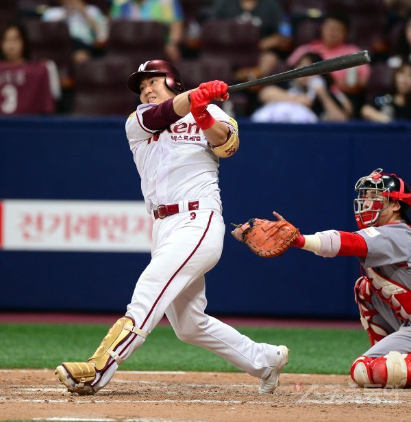 2일 서울 고척스카이돔에서 ‘2017 타이어뱅크 KBO 리그’ SK와이번스와 넥센히어로즈 경기가 열렸다. 8회말 2사 2루 넥센 김민성이 역전 1타점 중전 안타를 치고 있다.