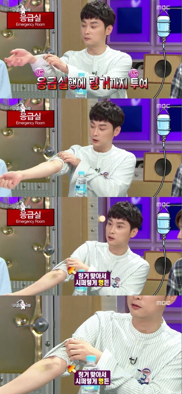이어 민경훈은 자신의 팔에 있는 링거 자국을 보여주며 응급실에 다녀왔다는 사실을 인증해 눈길을 끌었다.