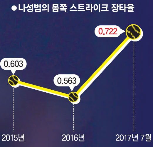 그러나 올 시즌 나성범이 달라졌다. 단순히 고타율을 기록하고 있어서가 아니다. KBO 공식기록업체 스포츠투아이에 따르면 7월 31일까지 그의 몸쪽 스트라이크 공략 타율은 0.481에 달한다. 지난해(0.333)에 비해 1할4푼8리나 상승했다. 2015년(0.349)에 비해서도 월등히 높아졌다. 올 시즌 10개 구단을 통틀어 몸쪽 스트라이크 대응력이 가장 좋다. 나성범이 몸쪽 공 타율 1위를 달리고 있고, 2위가 0.467을 기록하고 있는 구자욱(삼성)이다. 이어 3위 김재환(두산·0.442), 4위 송광민(한화·0.438), 5위 김문호(롯데·0.421) 순이다.
