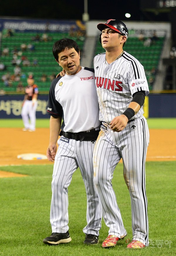 3일 서울 잠실야구장에서 ‘2017 타이어뱅크 KBO리그’ LG트윈스와 롯데자이언츠의 경기가 열렸다. 6회말 무사 1루에서 롯데 이정민의 견제구에 귀루하던 LG 오지환이 다리에 부상을 입고 트레이너의 부축을 받아 더그아웃으로 들어가고 있다.