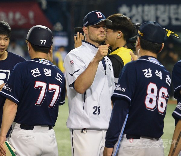 4일 서울 잠실야구장에서 열린 ‘2017 타이어뱅크 KBO리그’ LG트윈스와 두산베어스의 경기에서 두산이 11-4 대승을 거두며 5연승을 질주했다. 경기 후 승리투수가 된 두산 보우덴(가운데)이 코칭스테프와 하이파이브를 나누고 있다.