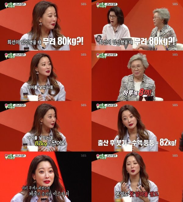 김희선은 “임신할 당시 80kg이 넘었다”며 “하루에 8끼 먹었다”고 했다. 이어 “아이를 낳고 난 뒤에도 82kg이더라. 아이를 낳았는데 왜 더 쪘는지 미스터리였다. 내가 나를 못 알아 볼 정도였다”고 이야기했다.