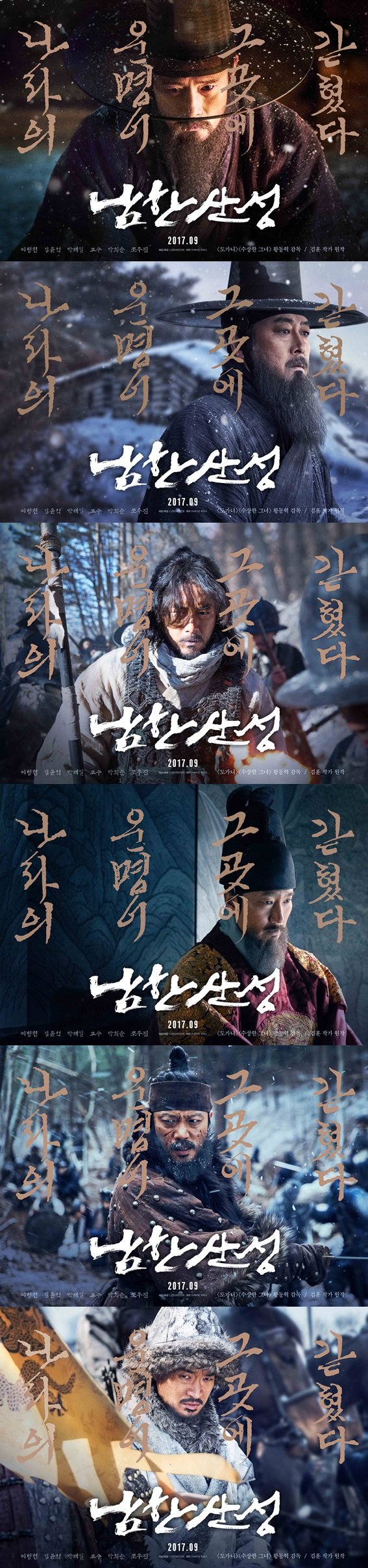 남한산성의 대장장이 \'날쇠\' 역 고수의 포스터는 민초의 신분에도 전쟁을 끝내기 위해 목숨을 걸고 격서 운반의 중책을 맡은 굳은 의지와 신념을 엿볼 수 있게 한다. 이어 혹한 속에서도 묵묵히 성벽을 지키는 수어사 ‘이시백’ 역 박희순의 포스터는 어떠한 악조건에도 굴하지 않고 전투에 뛰어든 모습으로 강렬함을 전한다. 마지막으로 청나라의 역관 ‘정명수’ 역을 연기한 조우진의 포스터는 서늘한 표정과 눈빛으로 시선을 사로잡으며 조선인의 신분에도 청의 통역을 담당하는 캐릭터에 대한 궁금증을 자아낸다. 여기에 포스터와 어우러지는 "나라의 운명이 그곳에 갇혔다"라는 카피는 고립무원의 남한산성 속 조선의 운명과 백성의 목숨이 걸린 치열했던 47일 간의 이야기를 예고하며 기대감을 높인다.
