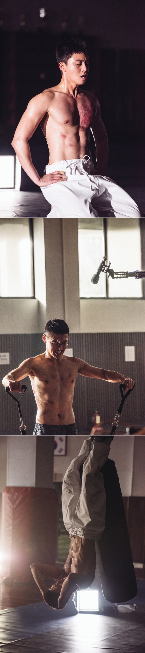 ‘청년경찰’의 혈기왕성한 경찰대생 ‘기준’(박서준)과 ‘희열’(강하늘)은 극 초반 젊고 유쾌한 매력으로 웃음을 유발하며 시선을 사로잡는다. 20대 초반 청년의 풋풋함을 간직한 이들은 본격적으로 수사에 착수하면서 180도 달라진 분위기를 발산하는데, 이 과정에서 강렬한 카리스마로 무장한 상남자의 반전 매력이 제대로 드러난다. 이번에 공개된 스틸은 풋풋했던 청년에서 한층 더 거칠어진 모습으로 거듭난 ‘기준’과 ‘희열’이 눈길을 끈다. 다부진 어깨와 탄탄한 몸을 드러낸 채 윗몸일으키기를 하거나 팔굽혀펴기를 하는 등 운동에 몰두하고 있는 이들의 모습은 열혈 청춘의 끓어 넘치는 에너지를 고스란히 보여주는 동시에, 사건 해결을 위한 비장한 각오까지 느끼게 한다.