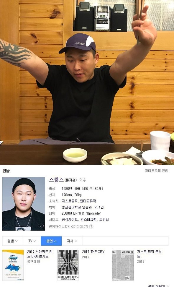 사진 속에는 한 포털 사이트에 공개된 스윙스의 프로필이 담겼다. 이목을 끄는 건 ‘90kg\'로 기재돼 있는 그의 몸무게. 이에 스윙스는 크게 반발하며 자신의 몸무게는 ’68kg\'고 밝혀 웃음을 자아냈다.