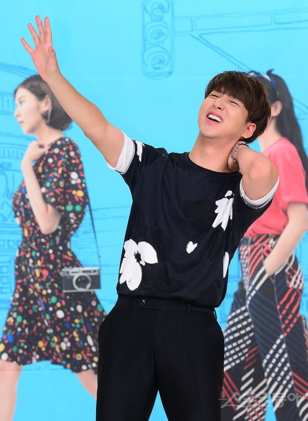 B1A4 바로가 익살스러운 포즈로 포토타임을 가지고 있다.