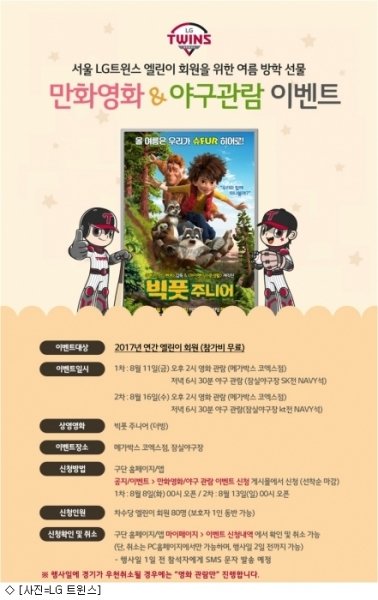 프로야구 서울 LG 트윈스가 여름방학을 맞이해 엘린이회원(LG 트윈스 어린이 회원)을 대상으로 영화관에서 만화영화를 보고 야구장에서 홈경기 관람을 한꺼번에 즐길 수 있는 행사를 실시한다.