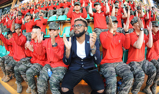 K리그 클래식(1부리그) 포항 스틸러스의 홈경기가 열릴 때마다 스틸야드 관중석 2층에는 늘 귀한 손님이 찾아온다. 포항 해병대 교육단에 근무 중인 장병들이다. 해병대 특유의 붉은색 티셔츠와 팔각모를 쓴 이들은 매 경기 해병대 박수와 함께 군가를 부르며 선수들을 응원한다. 포항의 외국인선수 무랄랴(24·브라질)는 경기를 마치면 곧장 해병대가 앉아있는 관중석으로 향한다. 그는 군가를 부르는 해병대 장병들을 바라보며 함께 해병대 박수를 친 뒤 거수경례를 잊지 않는다.
