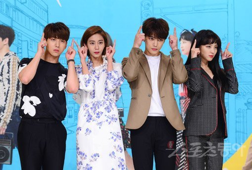 7일 열린 KBS 2TV ‘맨홀:이상한 나라의 필’ 제작발표회에 참석한 주연배우들이 드라마의 분위기를 담은 듯한 코믹한 포즈를 취하며 시청자에게 전할 ‘웃음’을 예고하고 있다. 왼쪽부터 바로 유이 김재중 정혜성. 김진환 기자 kwangshin00@donga.com