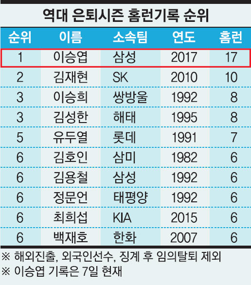 지금까지 어떤 위대한 타자도 10개를 넘기지 못한 은퇴시즌 최다 홈런 기록이다. 이승엽은 8일 대구 LG전 4회말 2점 홈런을 때리며 시즌 18호를 기록했다(6회 현재). 수치상 시즌 마지막까지 25개 안팎의 홈런이 가능하다.