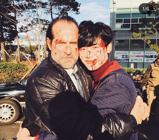 ‘VIP, 8월24일 개봉’이라는 친절한 설명과 함께. 그 가운데 할리우드 영화배우 피터 스토메어와 피범벅이 된 얼굴로 껴안고 있는 모습이 무척이나 인상적이다.