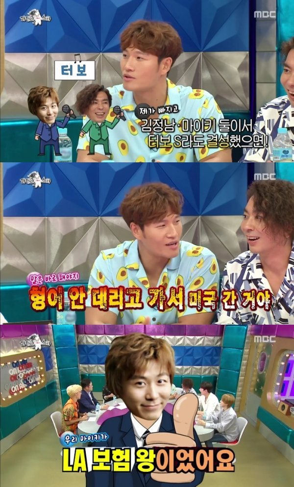 이어 김종국은 “마이키는 정남이 형이 안 데리고 가서 미국행을 결정한 것”이라며 “L.A 보험왕이었다”고 말해 웃음을 자아냈다.