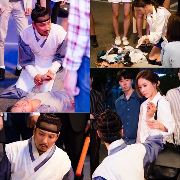 공개된 사진 속 허임과 최연경은 극과 극 비주얼만으로도 흥미를 자극한다. 혜민서 의원 복장으로 서울 한 복판에 나타난 허임과 초미니스커트로 퍼펙트 바디를 선보이는 최연경이 서로를 이상하게 받아들일 수밖에 없는 상황. 바닥에 쓰러진 응급 환자를 보고 의원본능을 발휘해 진지하게 맥을 짚는 허임의 카리스마와 눈빛이 몰입감을 선사한다. 상황을 파악하고 다가와 침을 놓으려는 허임의 손목을 잡고 막아선 최연경이 가방에서 도구들을 꺼내 응급처치에 나서는 장면은 걸크러쉬 매력을 발산하며 시선을 사로잡는다. 생애 처음 보는 의술에 놀라움을 금치 못하는 허임의 모습 역시 호기심을 증폭시킨다. 묘한 기류가 흐르는 사진만으로도 두 사람이 만나게 되는 특별한 사연에 대한 궁금증을 더한다.