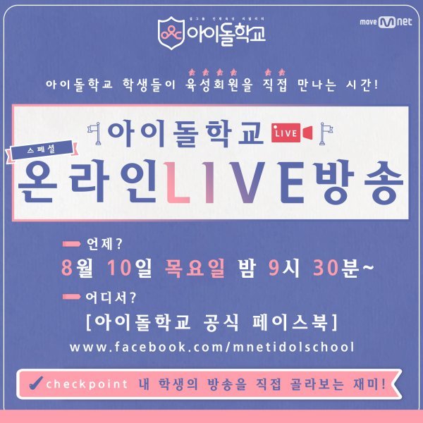 앞서 Mnet 측은 9일 "10일 밤 9시30분 공식 페이스북을 통해 '아이돌학교' 학생들의 특별 온라인 생방송이 진행된다"며 "이에 따라 '아이돌학교' 방송 시간에는 지난 회차 하이라이트가 방송될 예정"이라고 밝혔다. 생방송 문자 투표는 진행되지 않는다.