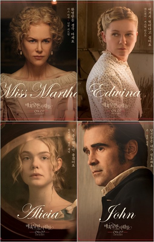 이번에는 공개하는 4종 캐릭터 포스터는 캐릭터와 혼연일체 된 배우들의 모습이 우아한 비주얼과 어우러져 보는 이들을 압도하는 가운데 영화를 통해 밝혀질 세 여자와 한 남자의 비밀스런 관계에 대한 호기심 역시 한껏 고조시킨다. 여기에 로맨틱과 섹슈얼을 넘나드는 네 남녀의 시선 역시 대저택에서 벌어질 사건에 대한 궁금증을 자극한다. 뿐만 아니라 고혹적인 여인 ‘미스 마사’의 “환영받을 생각 마세요”, 순수한 처녀 ‘에드위나’의 “여기서 벗어나고 싶어요”, 도발적인 10대 소녀 ‘알리시아’의 “날 좋아했으면 좋겠어요”라는 대사가 그녀들을 매혹시킨 남자 ‘존의 “당신들을 내가 필요해요”라는 대사와 대비되며 ‘매혹당한 사람들’을 향한 관람욕구를 고조시킨다. 9월 7일 개봉.
