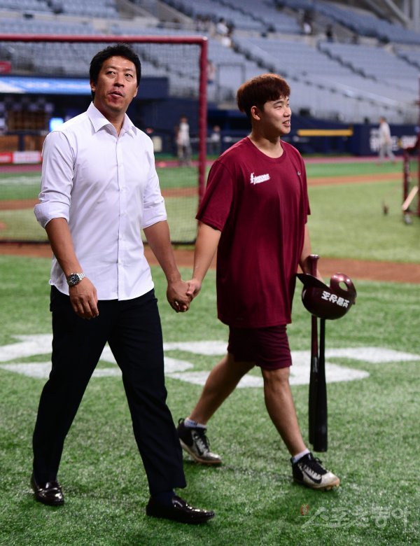 13일 서울 고척스카이돔에서 ‘2017 타이어뱅크 KBO리그’ 넥센 히어로즈와 한화 이글스의 경기가 열린다. 경기전 넥센 김웅빈과 이병규 해설위원이 나란히 그라운드를 걷고 있다.