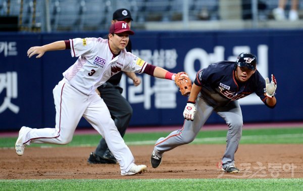 13일 서울 고척스카이돔에서 ‘2017 타이어뱅크 KBO리그’ 넥센 히어로즈와 한화 이글스의 경기가 열렸다. 3회초 1사 2루에서 한화 오선진의 내야 땅볼 때 2루 주자 박준혁이 넥센 김민성에게 태그 아웃되고 있다.