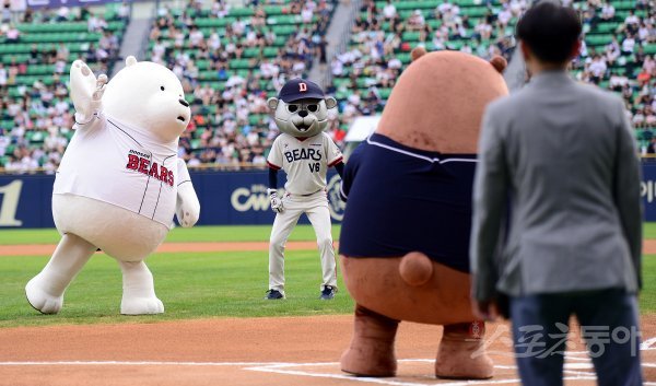 13일 서울 잠실야구장에서 ‘2017 타이어뱅크 KBO 리그’ NC다이노스와 두산베어스 경기가 열렸다. 경기 전 영화 ‘극장판 위 베어 베어스: 곰 브라더스’의 아이스베어가 시구를 하고 있다.