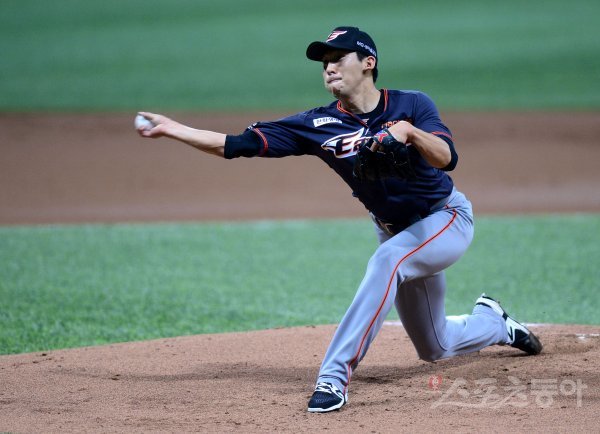 13일 서울 고척스카이돔에서 ‘2017 타이어뱅크 KBO리그’ 넥센 히어로즈와 한화 이글스의 경기가 열렸다. 한화 선발투수 김재영이 힘차게 볼을 던지고 있다.