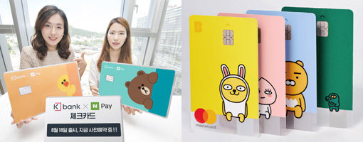 케이뱅크·카카오뱅크 등 인터넷전문은행 원투펀치의 행보가 예사롭지 않지만, 시중은행 자리까지 위협하려면 넘어야 할 산이 많다. ‘라인프렌즈’ 캐릭터를 넣은 케이뱅크의 ‘네이버페이 체크카드’(왼쪽)와 ‘카카오프렌즈’ 캐릭터를 전면에 내세운 카카오뱅크 체크카드.사진제공 l 카카오뱅크·케이뱅크