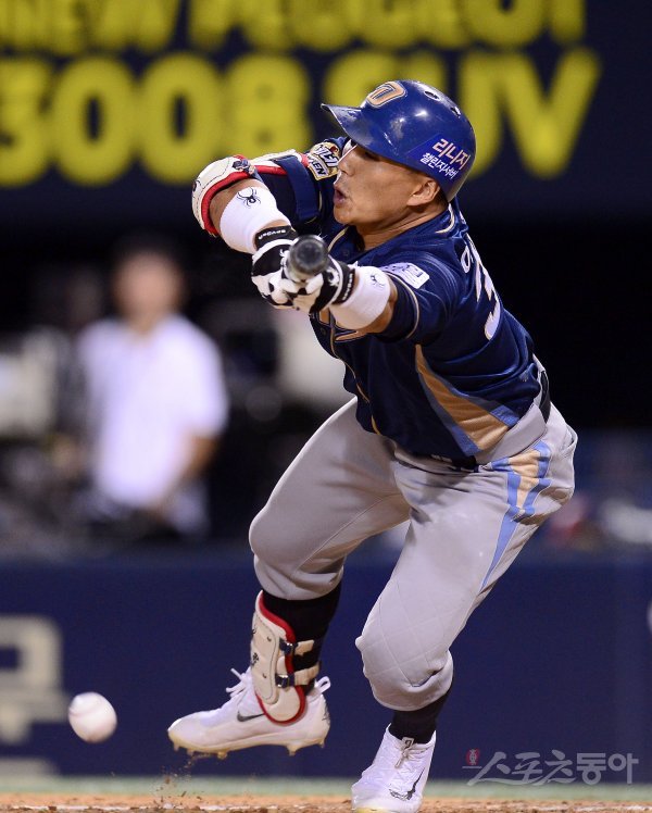 13일 서울 잠실야구장에서 ‘2017 타이어뱅크 KBO 리그’ NC다이노스와 두산베어스 경기가 열렸다. 8회초 1사 2,3루 NC 이종욱이 스퀴즈번트를 성공시키고 있다.