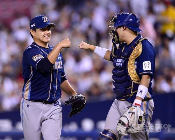 13일 서울 잠실야구장에서 ‘2017 타이어뱅크 KBO 리그’ NC다이노스와 두산베어스 경기가 열렸다. 선발 투수로 등판한 NC 장현식이 6회까지 무실점으로 막은 후 더그아웃으로 들어가며 포수 박광열과 주먹을 맞대고 있다.