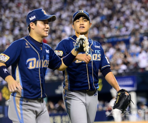 13일 서울 잠실야구장에서 ‘2017 타이어뱅크 KBO 리그’ NC다이노스와 두산베어스 경기가 열렸다. 선발 투수로 등판한 NC 장현식이 7회말 2사 1,3루 상황에서 두산 민병헌을 삼진 아웃시킨 후 기뻐하고 있다.