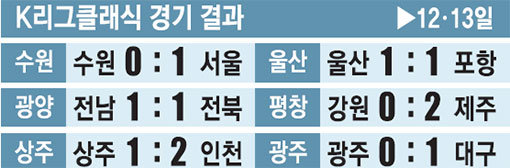 제주는 후반 중반 이후 파상공세를 펼친 강원의 공격에 고전했지만 한 골도 내주지 않으면 이전에 당한 2번의 패배를 설욕했다. 올 시즌 강원을 상대로 첫 승점(3점)을 챙긴 제주는 13승5무7패(승점44)로 3위 수원(13승7무6패·승점46)을 승점 2차로 추격했다. 내년 아시아축구연맹(AFC) 챔피언스리그 진출을 노리는 강원(10승7무9패·승점37)은 6위로 제자리걸음했다.