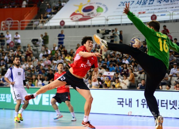 15일 서울 송파구 올림픽공원 SK 핸드볼경기장에서 ‘2017 서울컵 국제핸드볼대회’ 한국과 이란의 경기가 열렸다. 전반 한국 정의경이 이란 골키퍼를 앞에 두고 슛을 날리고 있다. 한국은 이란을 상대로 7점차 이상 승리하면 우승을 확정짓는다.