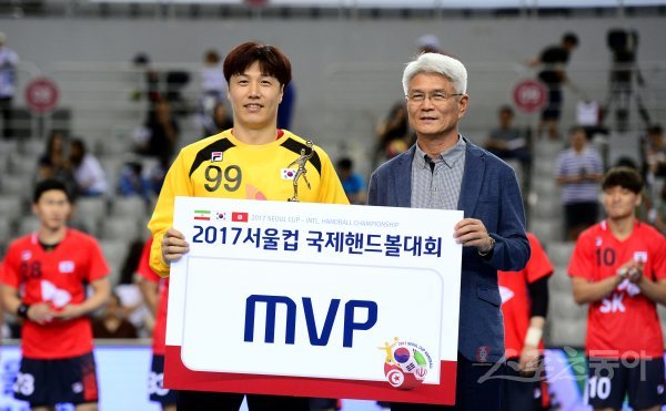 15일 서울 송파구 올림픽공원 SK 핸드볼경기장에서 열린 ‘2017 서울컵 국제핸드볼대회’ 한국과 이란의 경기에서 한국이 이란에 33-22로 승리하며 우승을 차지한 뒤 MVP로 선정된 이창우가 곽합 국군체육부대 부대장과 기념촬영을 하고 있다.