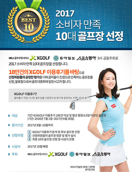동아일보, 스포츠동아, 국내 최대 골프부킹서비스 XGOLF(대표 조성준)가 주최하는 ‘2017 소비자 만족 10대 골프장’은 직접 골프장을 찾는 XGOLF 회원들과 소비자 위원들의 평가가 더해지는 공정한 과정을 통해 결정된다.