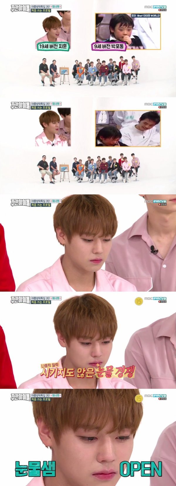 이날 워너원 박지훈은 “저때는 그냥 슬픈 노래만 나와도 감정을 순식간에 잡으면 됐다”고 말했다. 이에 MC들은 슬픈 음악을 준비하며 그에게 눈물 연기를 제안했다.
