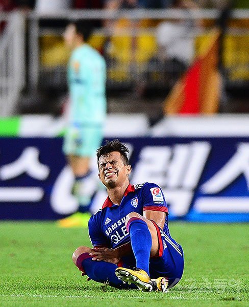 12일 수원월드컵경기장에서 ‘2017 KEB하나은행 K리그 클래식‘ 26라운드 수원삼성과 FC서울의 82번째 슈퍼매치가 열렸다. 전반 수원삼성 조나탄이 다리에 부상을 입은 후 고통스러워 하고 있다. 조나탄은 전반 종료를 앞두고 교체됐다. 수원 | 김진환 기자 kwangshin00@donga.com
