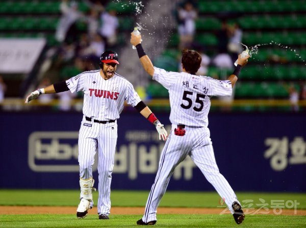 16일 서울 잠실야구장에서 ‘2017 타이어뱅크 KBO리그’ LG 트윈스와 kt 위즈의 경기가 열렸다. 연장 10회말 1사 만루에서 LG 로니가 끝내기 안타를 치고 난 뒤 포효하고 있다.