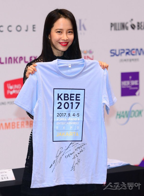 배우 송지효가 친필 사인이 된 티셔츠를 들고 포토타임을 가지고 있다.