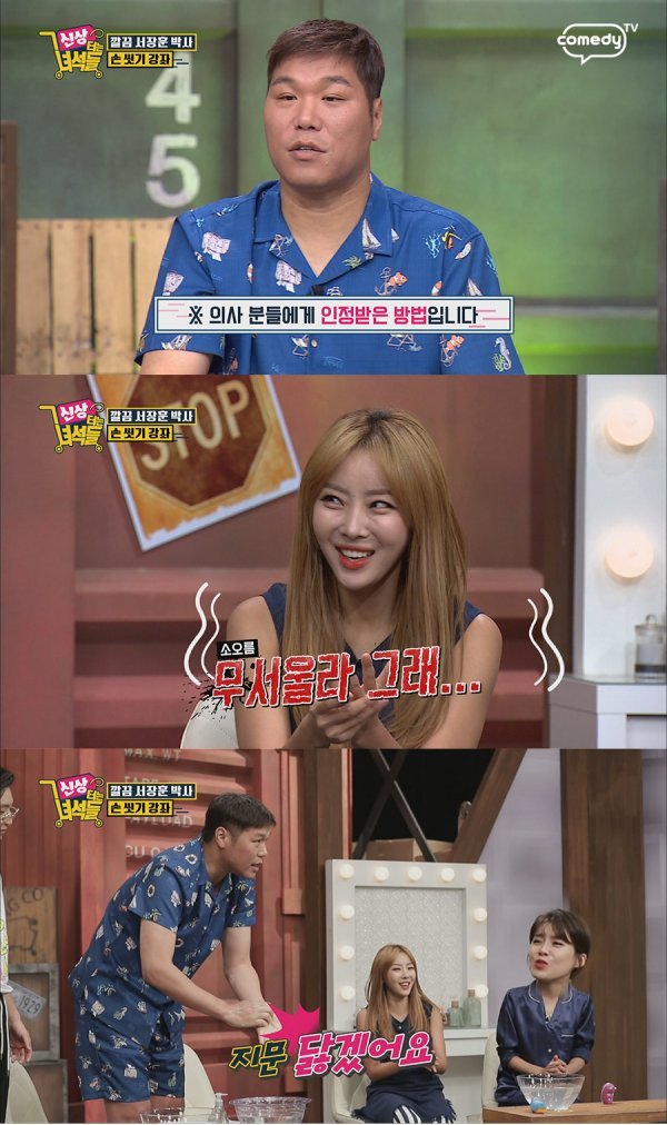 서장훈은 비누를 묻힌 후 손을 씻기 시작했고 이를 본 나르샤는 “무서우려고 그래..”라며 긴장된 모습을 보였다. 장도연 역시 “지문 닳겠어요”라며 서장훈의 손 씻는 모습에 당황해 했다. 허경환도 서장훈에게 “이걸 몇 번 반복하냐”라는 질문을 했고 서장훈은 “하루 종일 한다”며 깔끔왕 면모를 드러냈다.