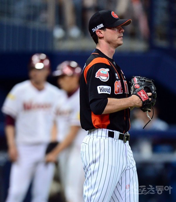 17일 서울 고척 스카이돔에서에서 ‘2017 타이어뱅크 KBO리그’ 넥센 히어로즈와 롯데 자이언츠의 경기가 열렸다. 4회말 1사 1, 3루에서 넥센 박정음에게 2타점 3루타를 허용한 롯데 선발 레일리가 아쉬워하고 있다.