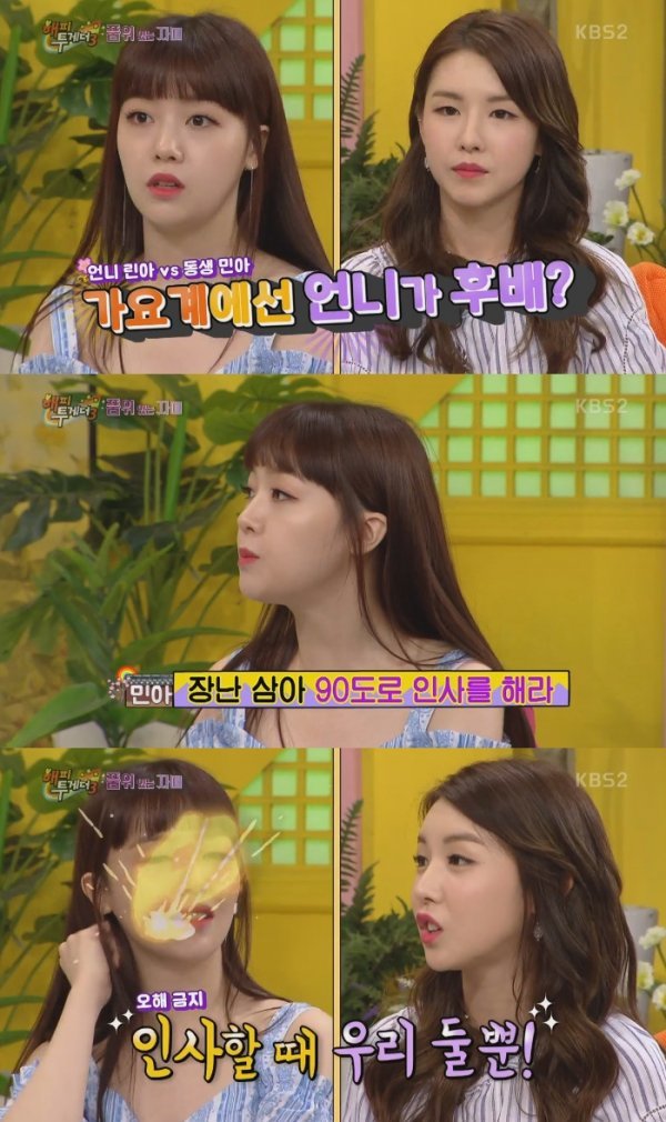 민아는 "장난 삼아 90도 인사를 해라고 했었다. 예전에 언니 대기실에 놀러갔는데 언니가 90도 인사를 해서 놀랐다"고 일화를 말했다.