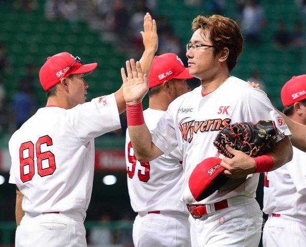 18일 인천SK행복드림구장에서 열린 2017 타이어뱅크 KBO리그 SK와이번스와 LG트윈스의 경기에서 SK가 7-2로 승리하며 5할 승률에 복귀했다. 경기 후 SK 박정권이 코칭스테프와 하이파이브를 하고 있다.