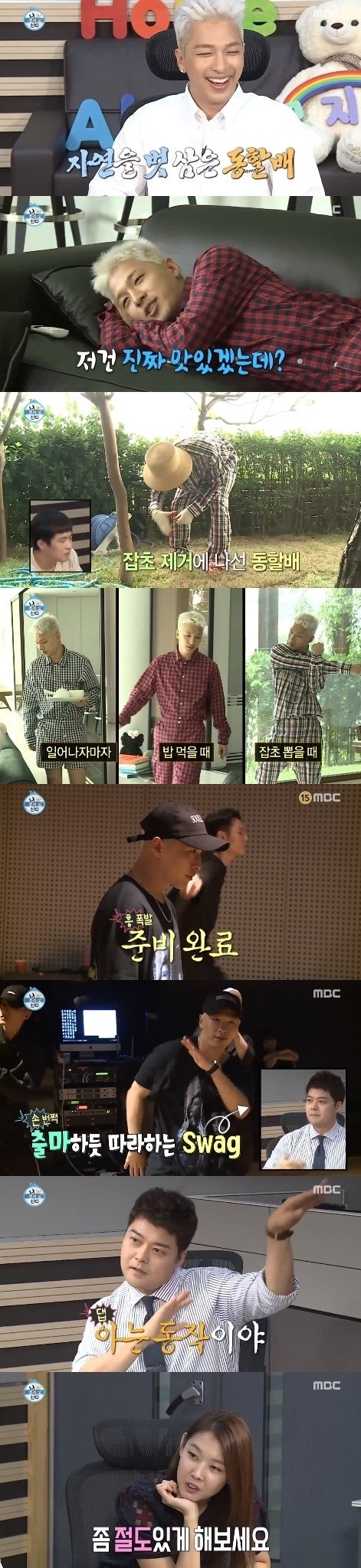 조경을 끝낸 태양은 샤워를 하고 소속사 YG엔터테인먼트로 출근했다. 콘서트 안무 연습을 위해서다. '나 혼자 산다'에 출연한 후 가장 정정한 모습이었다. 더 이상 동할배는 없었던 것. 무대 위 카리스마 있는 태양으로 변신했고 '굿보이' 안무 연습 장면을 보면 기안84는 흥분을 감추지 못해 결국 태양 앞에서 자신만의 빅뱅 안무를 선보여 재미를 더했다.