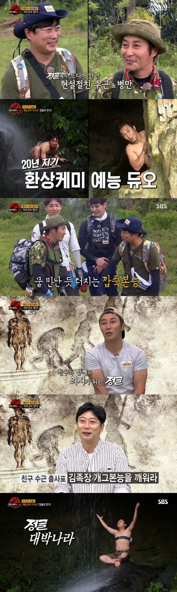 ‘절친’의 등장에 김병만은 눈에 띄게 밝은 모습을 보였다. 김병만은 이수근을 깜짝 놀래키는 등 평소에는 보기 힘든 장난을 치기도 했다. 두 사람은 쉴 새 없이 만담과 콩트를 주고 받으며 환상의 개그 콤비를 형성, 큰 웃음을 선사했다.