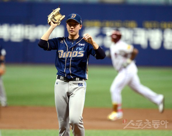 20일 서울 고척스카이돔에서 ‘2017 타이어뱅크 KBO 리그’ NC다이노스와 넥센히어로즈 경기가 열렸다. 선발 투수로 등판한 NC 강윤구가 1회말 1사 1루 넥센 초이스에게 투런 홈런을 허용한 후 아쉬워 하고 있다.