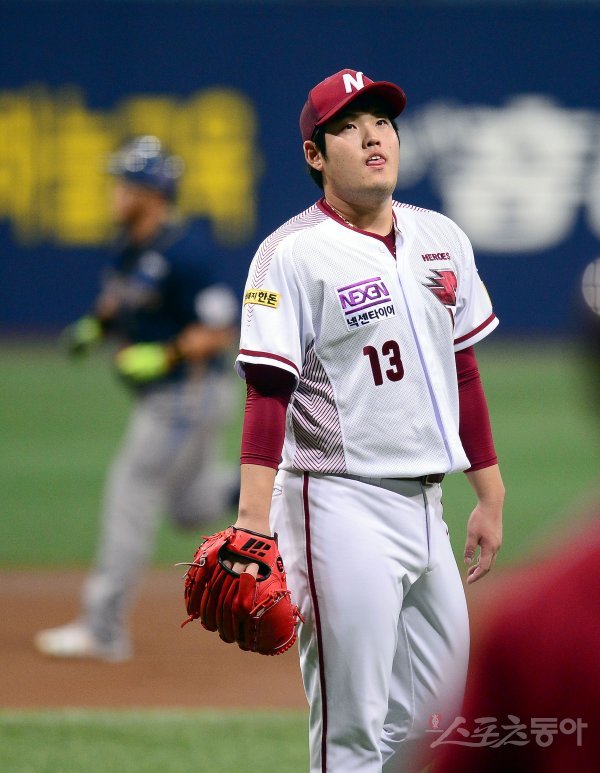 20일 서울 고척스카이돔에서 ‘2017 타이어뱅크 KBO 리그’ NC다이노스와 넥센히어로즈 경기가 열렸다. 선발 투수로 등판한 넥센 정대현이 1회초 1사 1,2루 상황에서 NC 나성범에게 스리런 홈런을 허용한 후 아쉬워하고 있다.