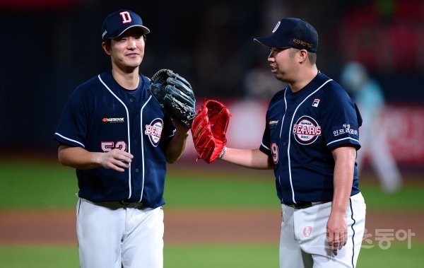 20일 수원 kt 위즈파크에서 ‘2017 타이어뱅크 KBO리그’ kt 위즈와 두산 베어스의 경기가 열렸다. 5회까지 kt 공격을 2실점으로 막은 두산 선발 유희관이 이닝 종료 후 김재호와 하이파이브를 나누고 있다.