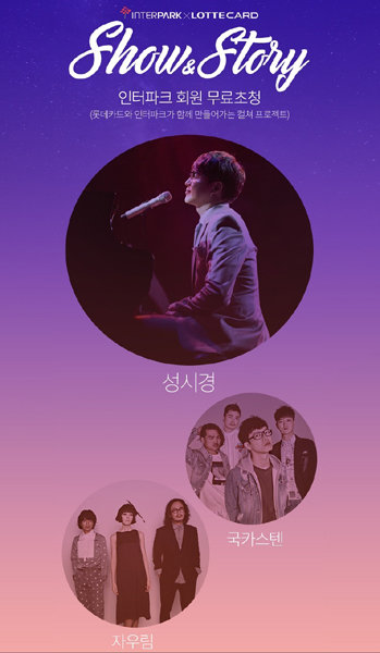 10월1일까지 인터파크에서 롯데카드로 5만원 이상 결제 고객 중 총 3000명에게 고려대 화정체육관에서 열리는 국카스텐·자우림 콘서트(10월25일)와 성시경 콘서트(10월26일) 티켓을 증정한다.