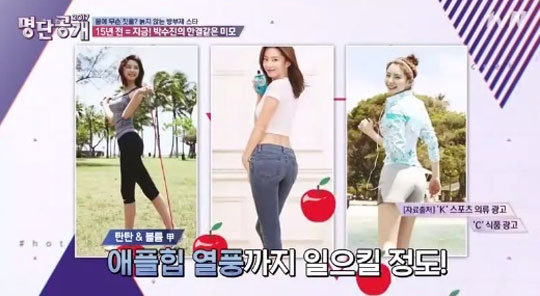 심지어 10년 전 공개된 수영복 화보에서도 완벽한 보디라인을 자랑하는가 하면 최근 애플 힙 열풍까지 일으켰을 만큼 탄탄한 몸매를 자랑했다. 또 박수진은 지난해 아이까지 출산했음에도 불구하고 세월을 거스른 몸매를 자랑해 감탄을 자아냈다.