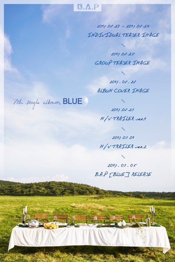 오픈된 스케줄에 따르면 B.A.P는 8월 23일, 24일 두 차례에 걸쳐 멤버별 개인 티저 이미지를 공개하며 25일 단체 티저, 28일 앨범 커버 이미지, 29일과 9월 1일은 뮤직비디오 트레일러 영상을 두 가지 버전으로 나누어 공개한다. 마지막으로 9월 5일 일곱 번째 싱글앨범 ‘BLUE’의 음원과 뮤직비디오를 발표하며 B.A.P가 전격 컴백한다.
