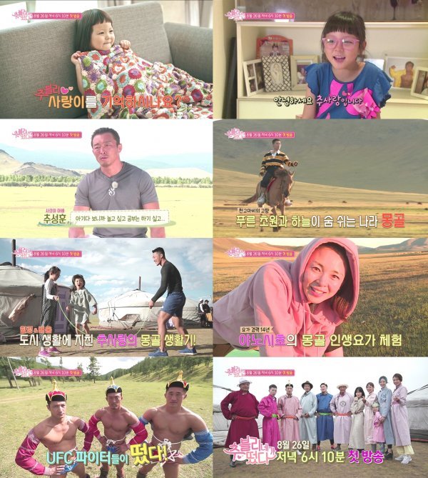 뒤이어 도시를 떠나 ‘몽골에서 살아보기’에 나선 멤버들의 모습이 공개됐다. 사랑이는 몽골 어린이와 함께 줄넘기를 하고, 말 타기에도 도전했다. 또 비눗 방울을 불며 얼굴 가득 함박 웃음을 지어 보는 이들을 미소 짓게 만들었다. 이 밖에도 야노 시호가 광활한 초원 한복판에서 요가를 하며 “인생 요가”라 감탄하는 장면, ‘악동뮤지션’의 이찬혁이 말을 타고 질주하는 장면, 추성훈-김동현-강경호-배명호 등 ‘UFC 파이터’들이 현지의 몽골 씨름단과 대결에 나서는 모습 등 몽골에서 펼쳐질 흥미진진한 에피소드들이 예고돼 본 방송에 대한 궁금증을 자아냈다.