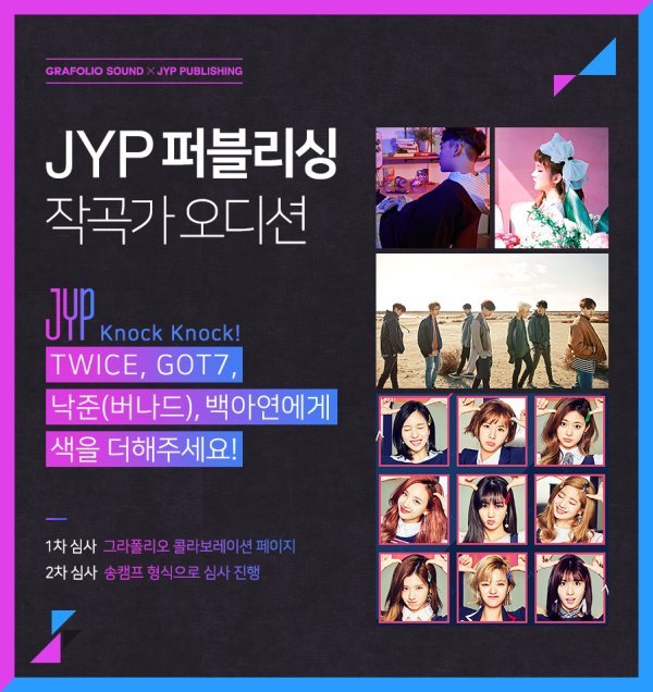 매년 꾸준히 작곡가 오디션을 열었던 JYP 퍼블리싱이 이번에는 네이버의 크리에이티브 콘텐츠 플랫폼인 그라폴리오 사운드와 콜라보레이션하여 작곡가 공모를 개최한다. 해당 오디션은 백아연, GOT7, 낙준, 트와이스에게 새로운 음악적 색을 더하고 타이틀곡이 될 수 있는 장르의 2곡을 대상으로 한다.
