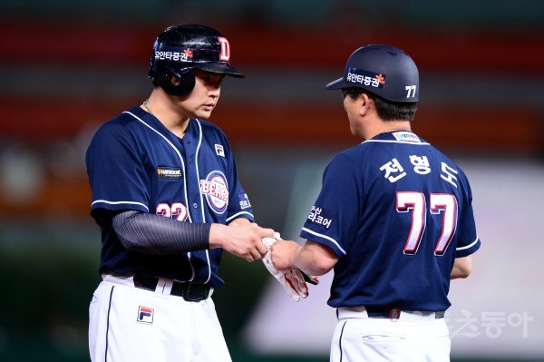 22일 인천 SK행복드림구장에서 ‘2017 타이어뱅크 KBO리그’ SK 와이번스와 두산 베어스의 경기가 열렸다. 7회초 2사 1루에서 두산 김재환이 1타점 2루타를 치고 난 뒤 전형도 코치의 환영을 받고 있다.
